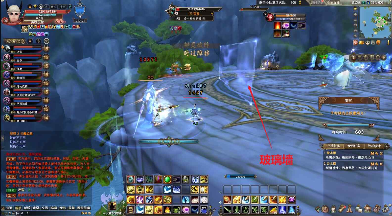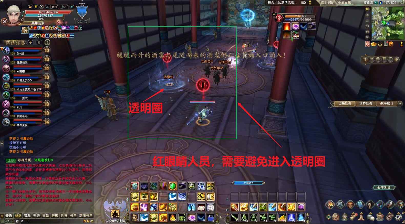 6)玻璃墙机制。boss每次到一定的血量会清除所有状态并无敌,然后出现玻璃墙机制,并把所有玩家传到第一个玻璃墙前,同时有几个小怪会一直跟着玩家,特别要注意,头上有红圈的玩家,不要被透明圈圈追到,如果被追到,会导致团灭。