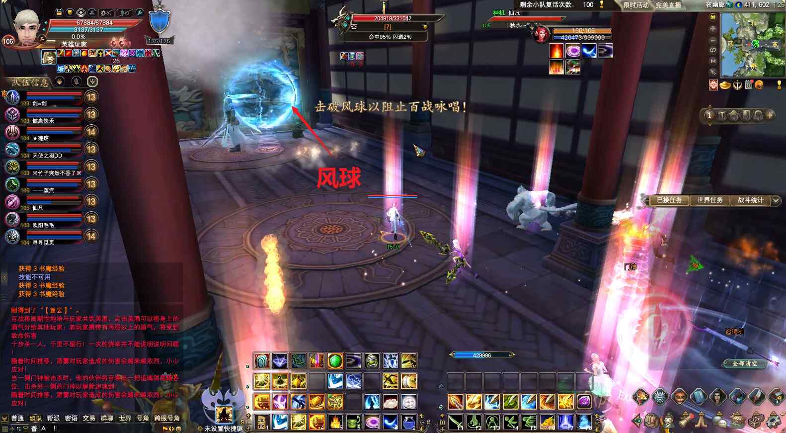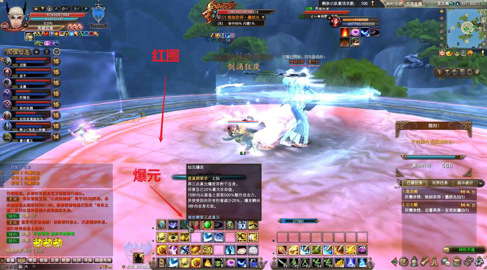 开怪正常打,不用爆元。等出圈后,负面选手给boss上状态(剑灵上剑印和破斧,武侠看到破斧后放龙),打手爆元,集中最大输出打。出第二波圈后,移动到圈外边缘,负面给boss上状态,打手爆元,集中最大输出打。快的话,两三波圈就能杀死boss通关。
