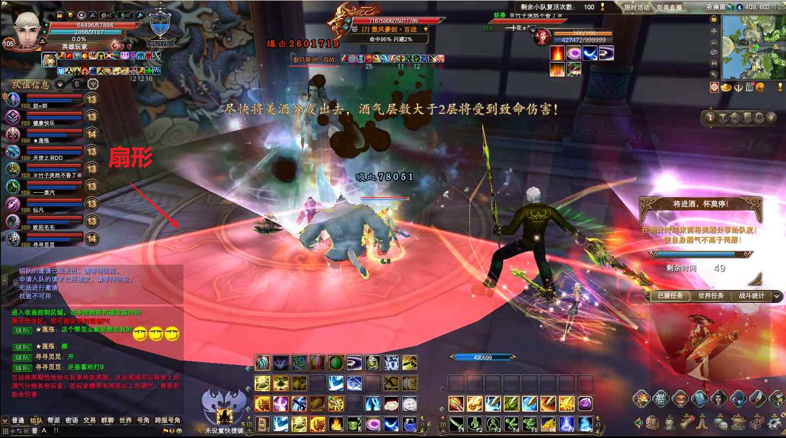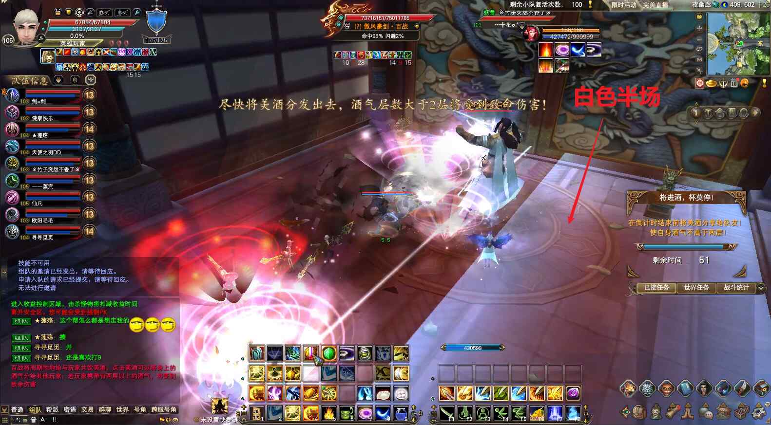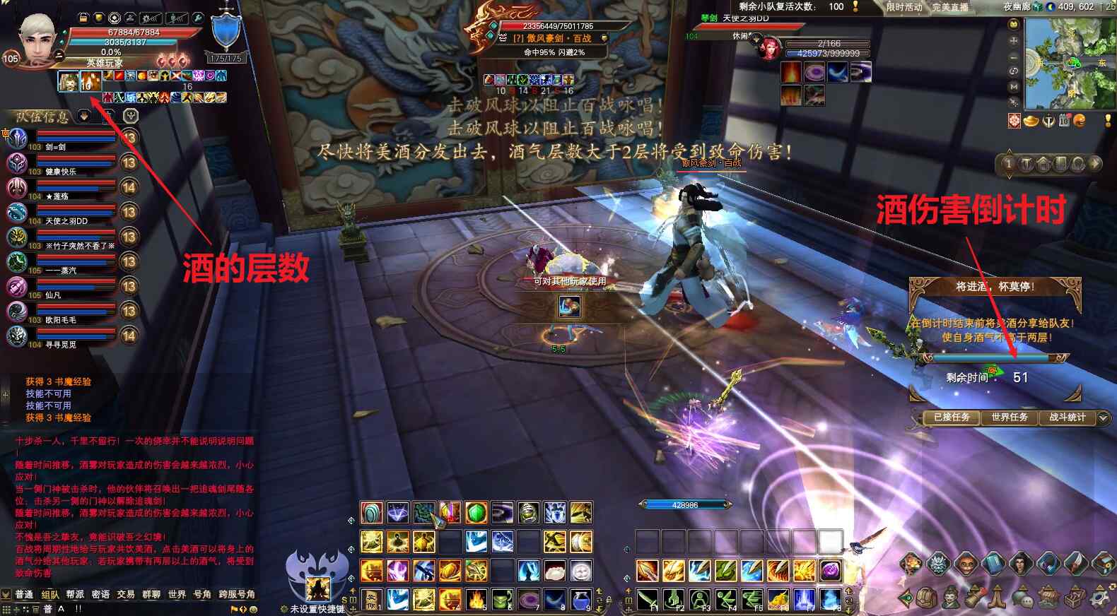4)酒的状态,在屏幕右边会出现倒计时,倒计时结束时,每层酒40%血量的伤害,可以用无敌药或者精灵的绝对领域技能抗过去;