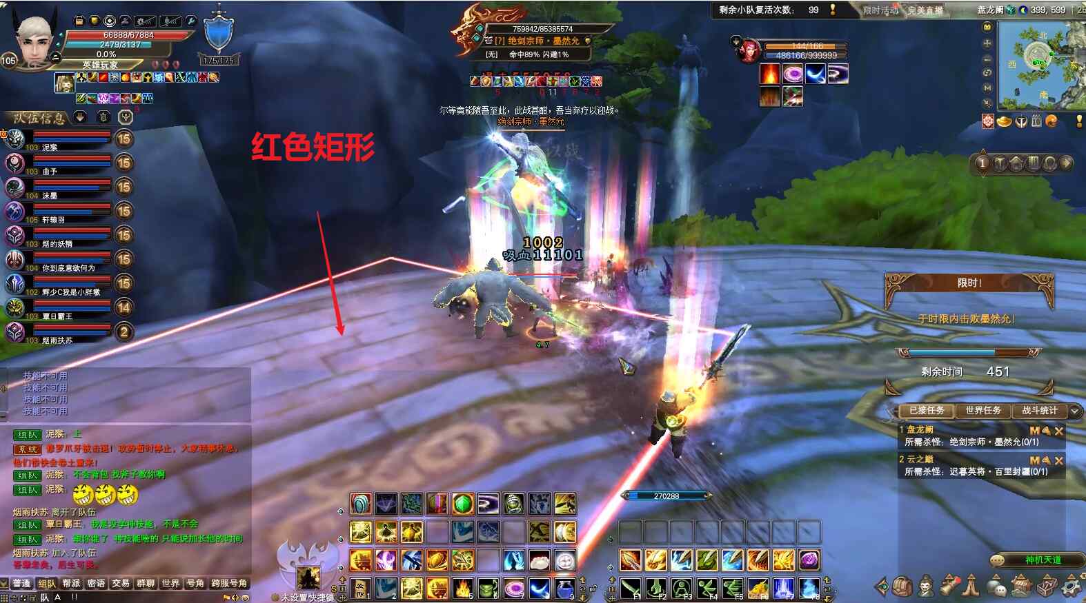时间限制:630秒,如果在8分钟内没有击败boss,boss会每隔20秒随机选择玩家,在上空落下几把剑,会对剑周围5米内的玩家造成致命伤,此时打败boss几乎不可能了。