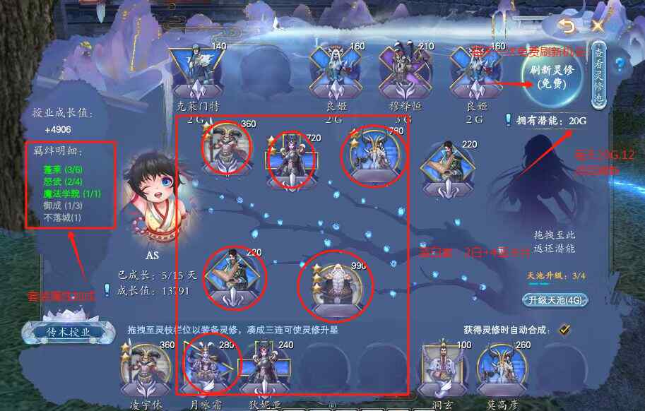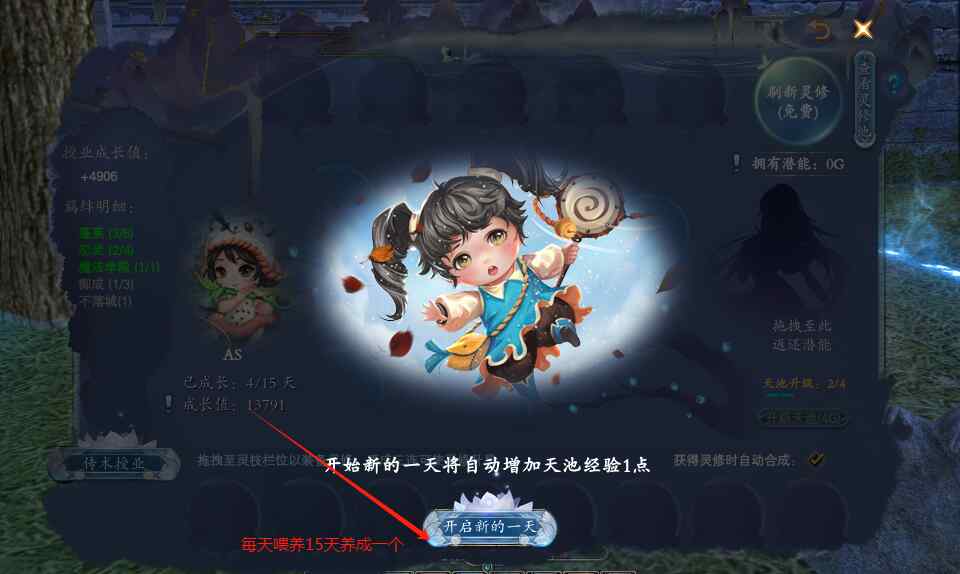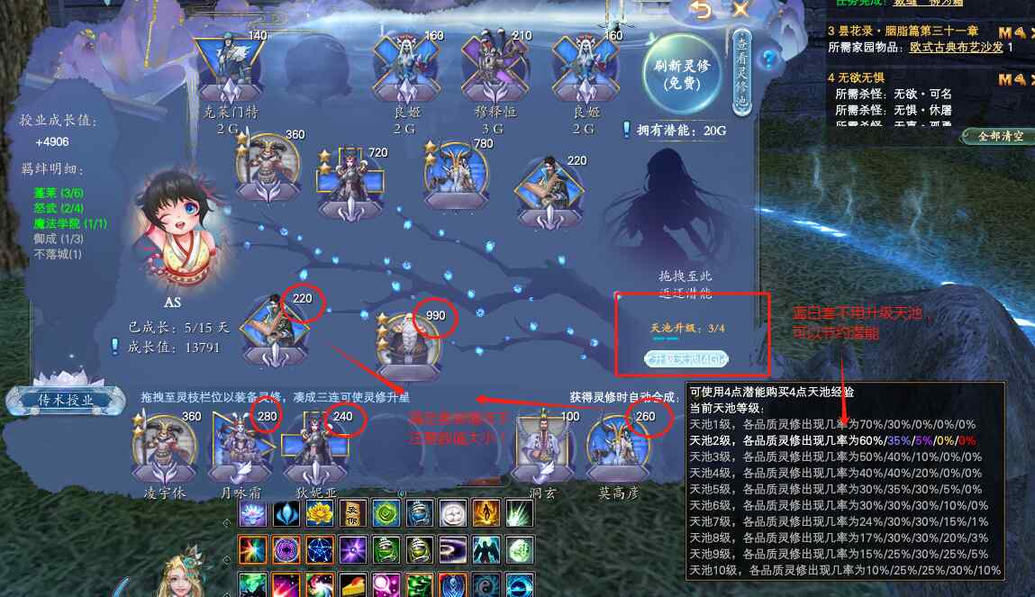 开启新的一天,我们可以看到小仙童拥有20G的潜能,以及一次免费刷新灵修的机会。后续每次刷新消耗2G潜能,购买灵修也需要花费相对应的潜能,也可以用潜能来购买天池经验,用于升级天池!天池等级越高,刷到高等级卡片的机率也越高!那是不是天池等级越高越好呢?每天就20G,怎么才够花呢?