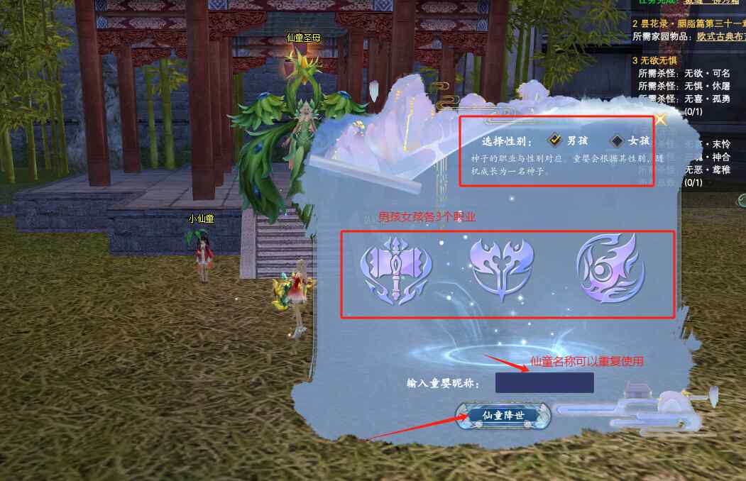 点击仙童圣母对话以后,会给你三男三女6个职业的仙童选择,可以任选其中一个性别职业降生,也可以选择你最缺神语级的仙童职业。仙童名字可以重复使用,大家随意就好!输入名字点击仙童降生,游戏界面右下角的仙童系统中,就会出现一个刚出生的仙童宝宝哦!