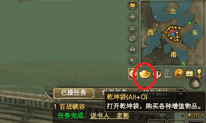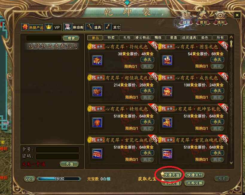 因此 进入游戏后,第一步就是点开乾坤袋充值6元宝,如下图红圈标记所示,