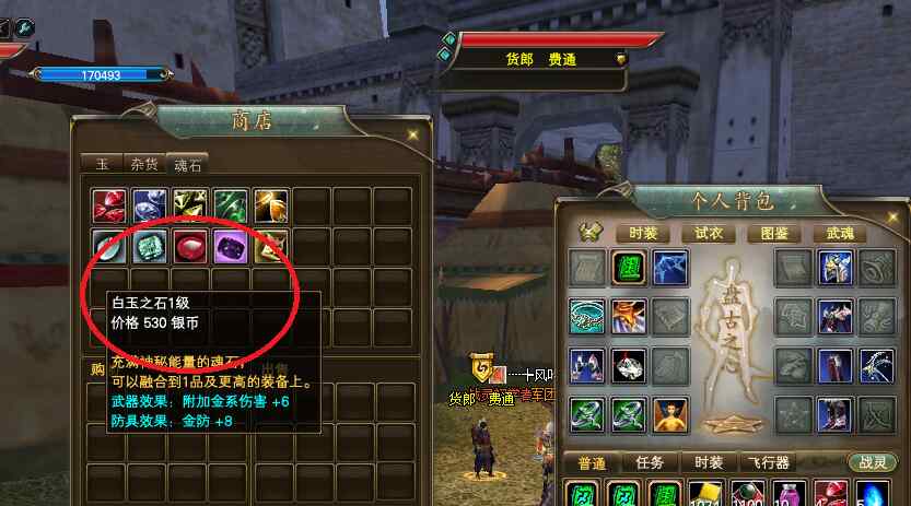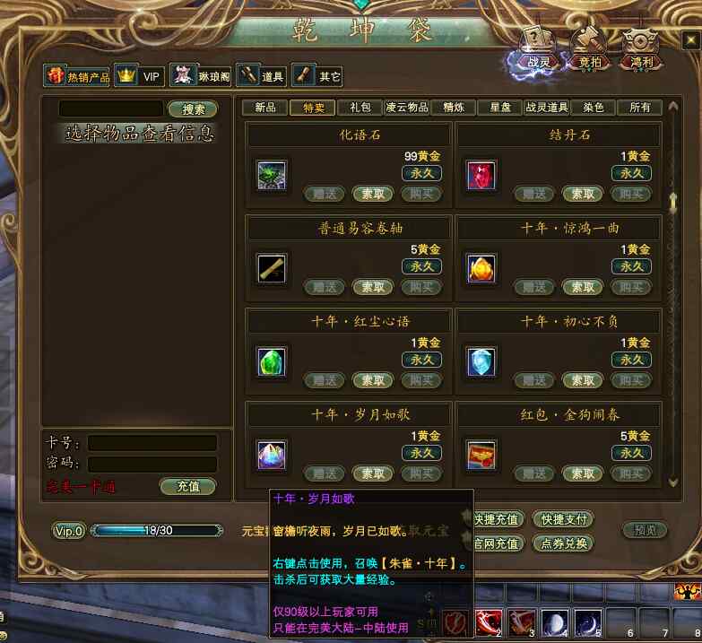 针对新号,游戏给了个福利,花费6元宝,可以获得一把13品武器和一个月时间的传送石及养生石。