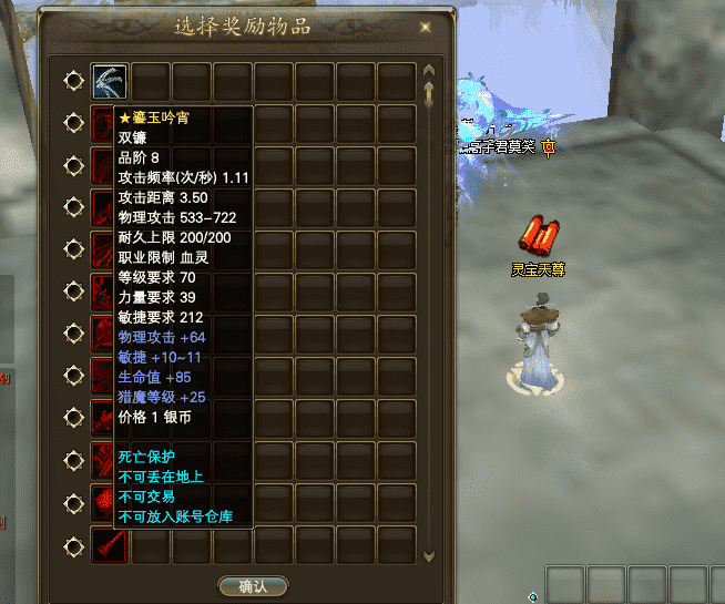 回到背包界面,打开礼包,就获得一把13品100级的地武,如下图所示,