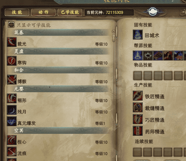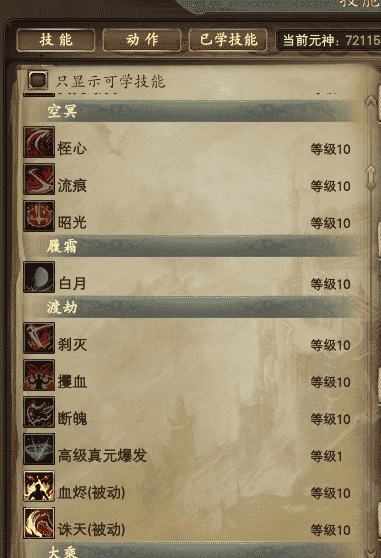 前期升级,元神有限,我们挑一些使用频率高的技能优先学习,使用率低的暂缓学习,