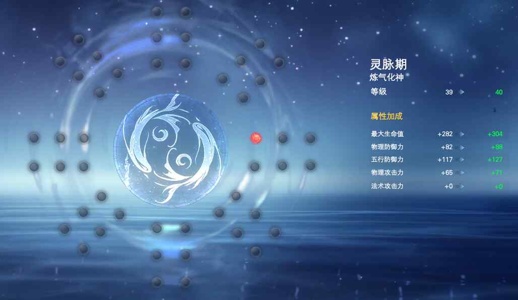 等级和境界提升起来了,别忘记成长方面还包括其他,比如灵脉系统,每天记得点下灵脉。如下图所示,