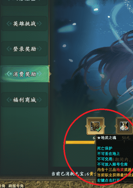 买了头号玩家礼包后,点击消费奖励,然后左键点击第一个地武按钮即可,如下图红圈标记所示,