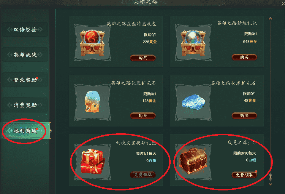 点击福利商城界面,每天可以免费领一个副本门票礼包 和10个战灵C,如下图红圈标记所示,