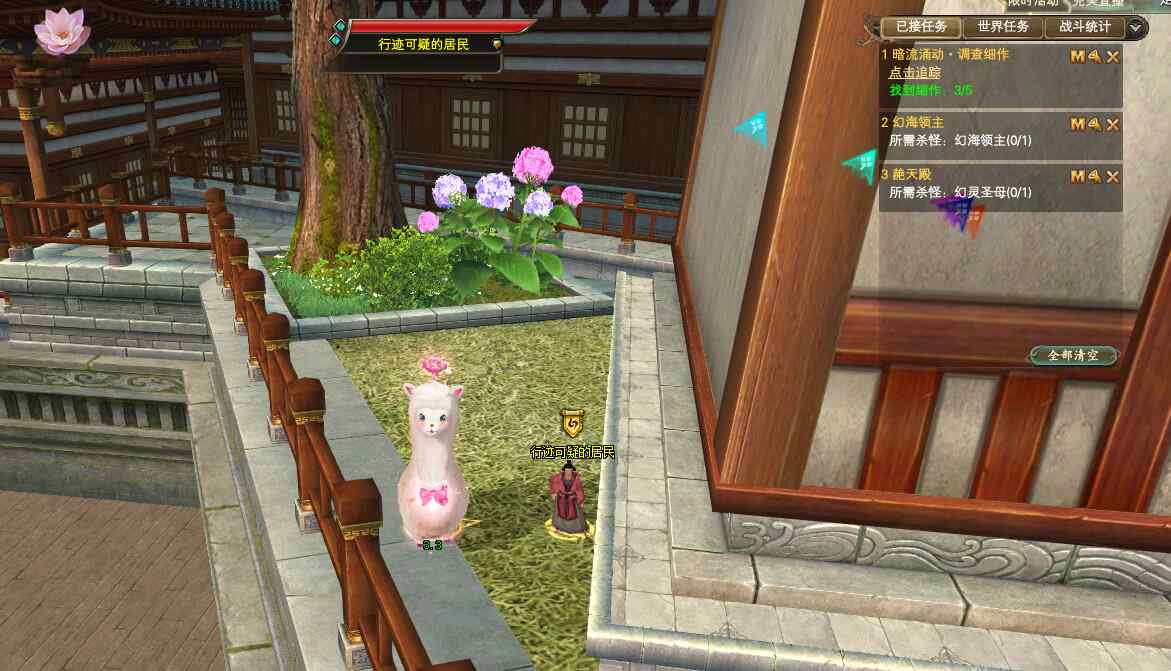 第四个:永安城的桥边,这个范围就比较大了,毕竟永安城有好几座桥。运气比较好,我在去青霜港的途中找到了桥边的NPC,行迹可疑的居民(191.313),传送到风兰书院,往青霜港飞的的途中,在安儒桥的桥头哦!对话完成后自动完成任务,就可以去找最后一个NPC了!