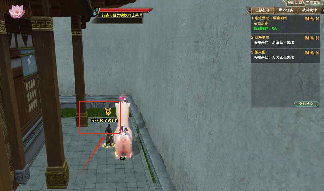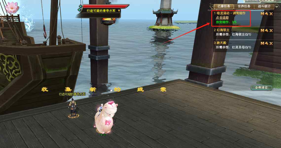 第三个:青帝水军附近。这个时候可以先传送到卫统府,然后到青帝水军的桥上,走到底就可以看到NPC,行迹可疑的青帝水军(100.405),点击NPC对话完成任务即可。