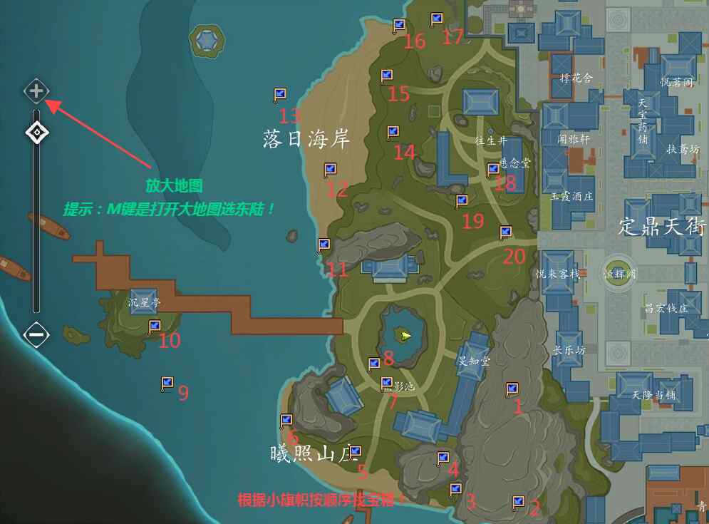 ③M键打开大地图帮按顺序追踪宝箱坐标,“+”、“-”是放大缩小地图帮查看最近坐标,各种颜色箭头提示附近坐标方向;