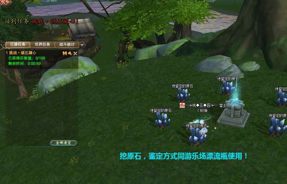 5.挑战.顽石凝心,又叫鉴定原石:限时挖原石,鉴定方法同游乐场漂流瓶使用,若限时内历练值达100提示挑战成功,直接挖宝箱。