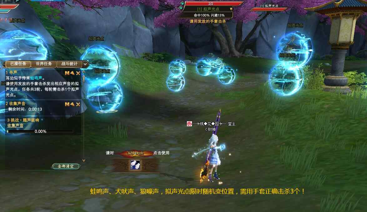 11.挑战.随声逐响,又叫收集声音:限时用手套击杀拟声光点,三堆拟声光点分别是蛙鸣声、犬吠声、狼嚎声,三堆拟声光点会定时消失后刷新且随机换位置,需用手套正确击杀3个拟声光点后挑战成功,再挖宝箱。