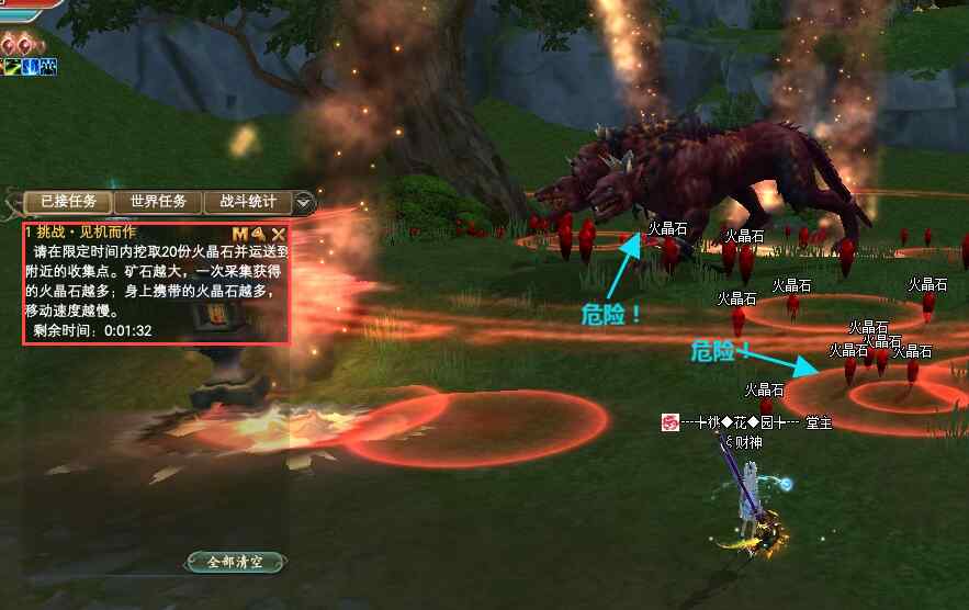 注意:身上携带火晶石越多移动速度越慢,建议中途有几份火晶石赶紧靠近收集点先交任务,火晶石收集是叠加模式!