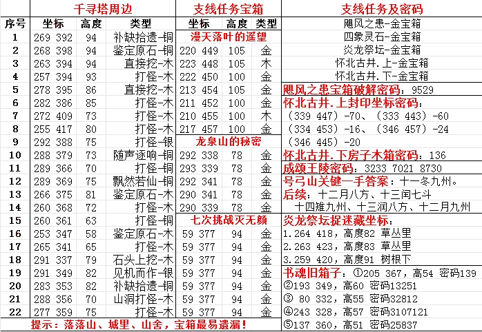 四、17支线任务,对新手比较难,建议百度查攻略,因涉及太多内容不再赘述,支线任务需密码见宝箱坐标图4,支线任务虽宝箱不多、但都是金銮宝箱且魂识多,建议大家必须重视,对提升永安心魂很重要。
