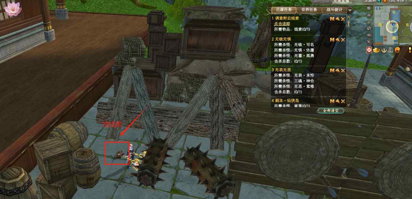 返回卫统府,根据追踪提示,到(133.418)触发任务,在附近(135.418)挖线索。如图所示,一个小小的物品箱子,不仔细看就错过了。