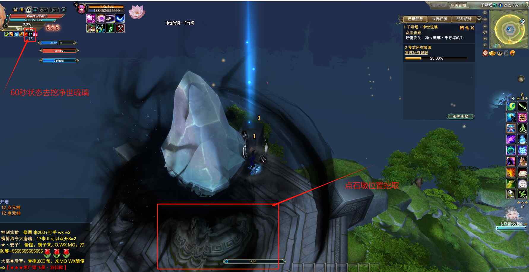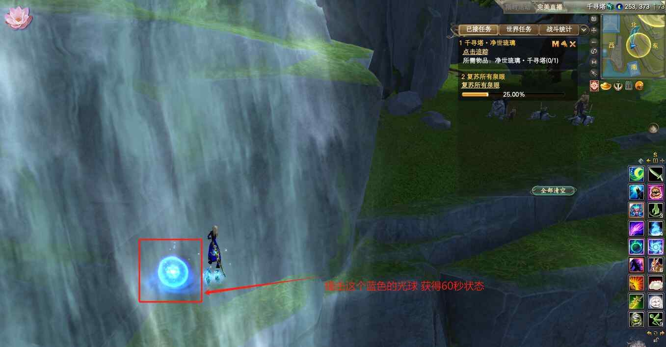 都挖完以后,回到千寻塔找赛慕(263.388)交任务。进入塔内后,继续对话赛慕,挖取面前的机关,弹出剧情动画,完成后回到塔外,对话新出现的NPC丰憬(263.389),接到任务净世琉璃,去(255.374.高度71)找水之宝珠,在瀑布的后面哦!撞击蓝色的光球,然后身上会有一个60秒的“仁”状态,这个时候赶紧加速飞行,去塔顶挖净世琉璃!如果觉得自己飞行时间来不及,就用地图传送回千寻塔。飞上塔顶挖水晶下面的石墩,鼠标多移动几次就能找到了!