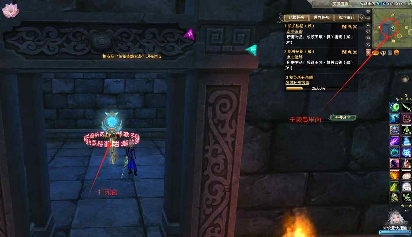 挖完以后,找赛慕(323.390)交任务,分别和赛慕和丰憬对话后,前往墓穴深处找到机关。(注意:这里任务可以飞起来进入墓穴深处哦,避开地上的怪,守护者怪会秒人!)