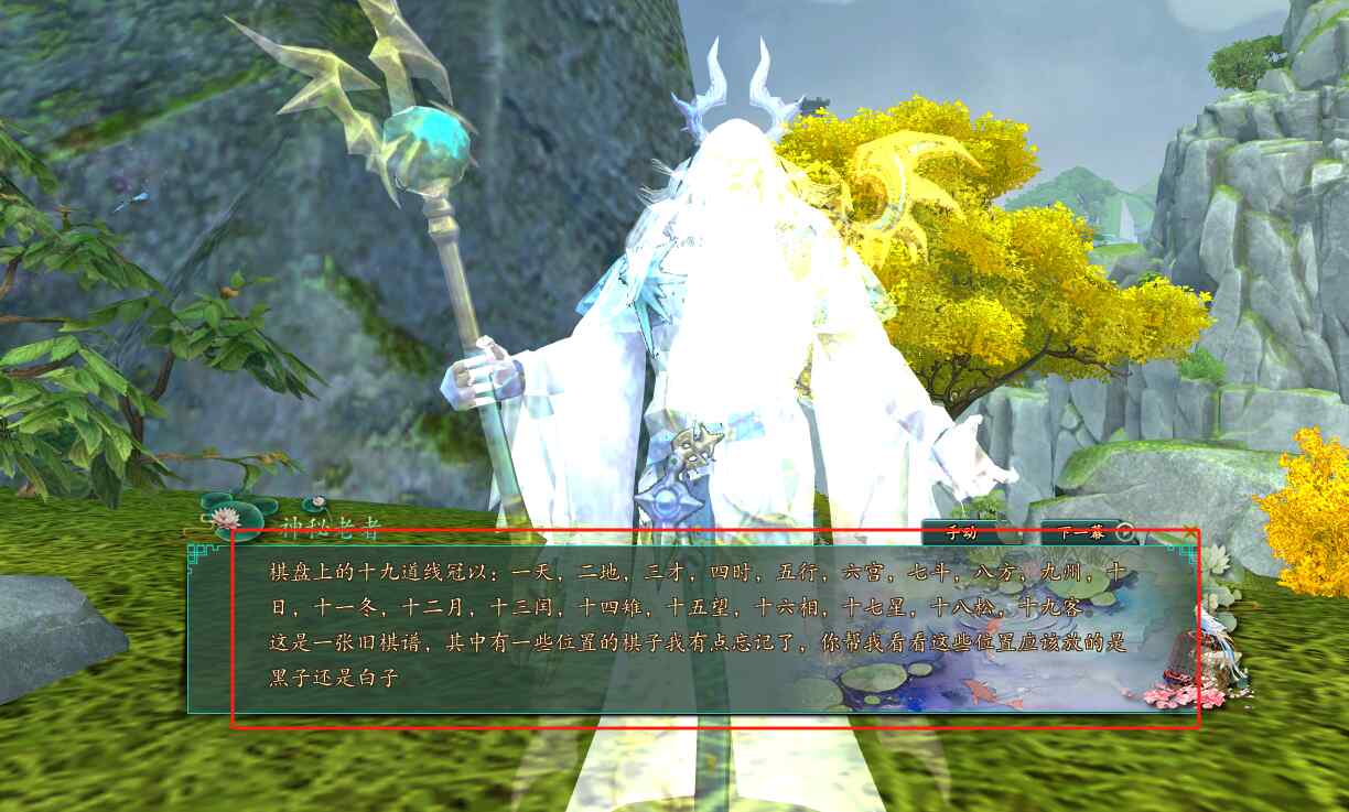 继续对话神秘老者,接到任务“关键一手”,答案是:十一冬九州。 任务提示有告知黑子的位置名称,最开始也有告知棋谱十九道线的名字,对应去找就可以了!任务完成后,获得机关秘钥三。(如果学过围棋那就更简单了!)
