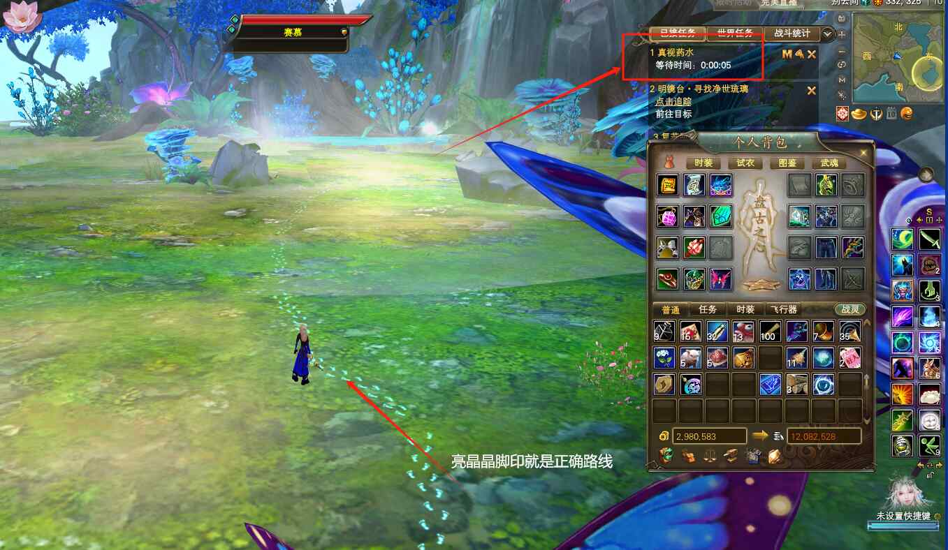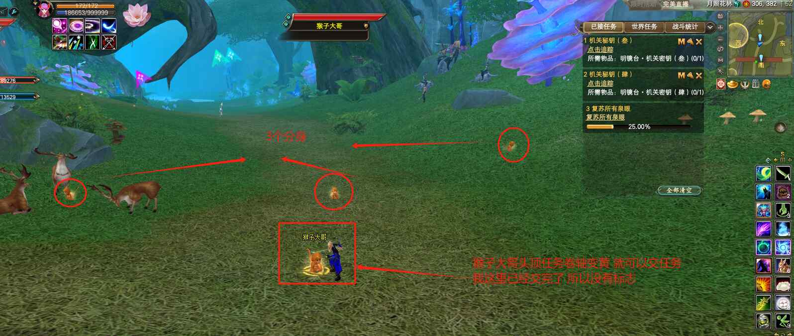 跳下瀑布,前往(301.360)对话小猴子,这时猴子开始边跑边出分身了,一直到出3只分身,我们跟着中间的一只到达(305.381),看到猴子大哥头上的灰色任务卷轴标志变亮,就去找猴子大哥交任务,如果任务没成功,说明我们跟的猴子是假的,这个时候再去找旁边的猴子,挨着猴子停留2秒,等猴子大哥头上卷轴变亮,就去交任务,直到找到真的猴子为止。注意:这里限时2分钟,如果两分钟没有完成任务,那任务失败,传送回悬崖钥匙处重新开始!(注意:这里很容易因为超过2分钟时间失败!小可爱们可以使用神行或者盗骊丹加速!)