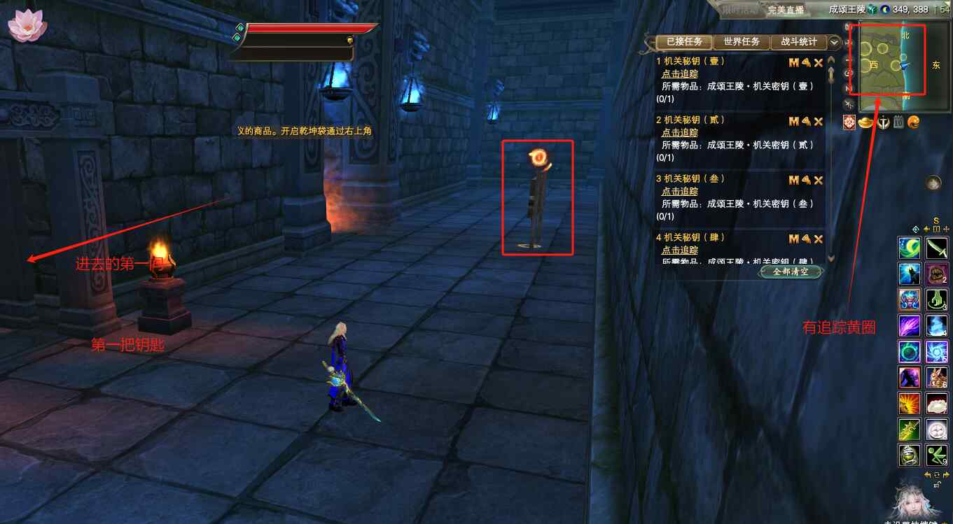 小技巧:四把钥匙都有追踪黄圈,王陵里面是“回字形”房间结构,爱迷路的小可爱,黄圈结合追踪坐标更容易找到哦!