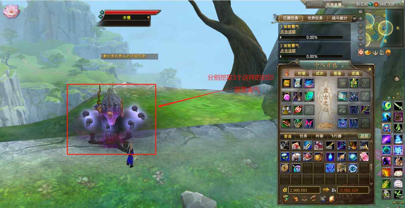 四把秘钥挖好了以后,返回明镜台,到山洞里(315.330.高度84)挖取机关,看完剧情动画后,前往别云间,和赛慕(331.325)对话接任务,这里包里会给一个真视药水,右键使用可以看到雾气里正确的路线,持续5秒时间,跟着路线,到达(340.321.)对话丰憬,接到驱散雾气任务。