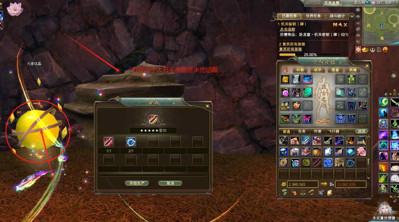 4把秘钥都挖好以后,去开启机关,在丰憬后面的龙山洞里(266.313)挖取机关,然后对着巨石使用包里的4星雷剑,打碎巨石后,进入山洞,挖取“元素结晶”。