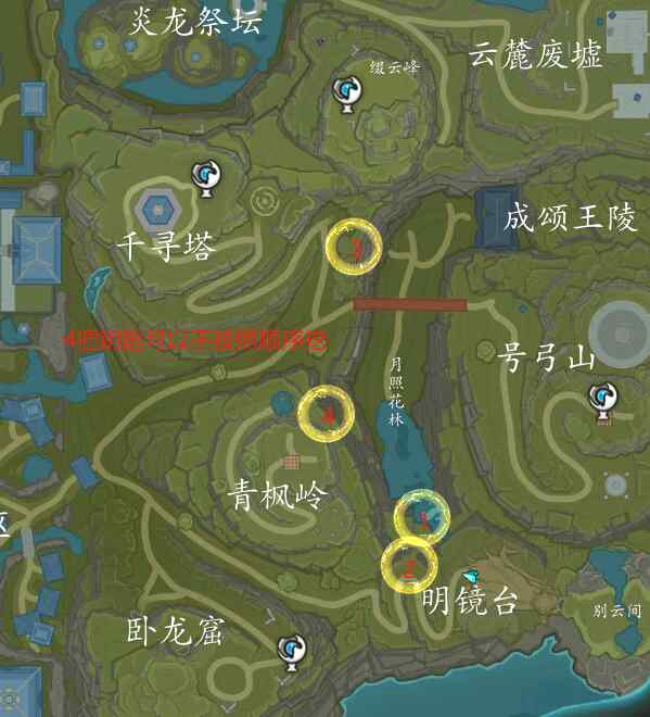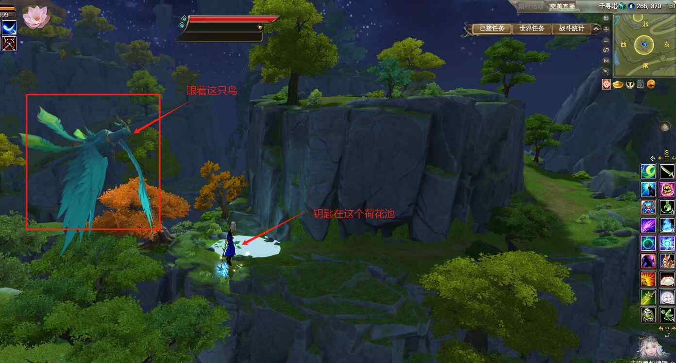 第四把钥匙,到(265.371.高度77)对话黑板,提示“飞鸟俯瞰之路,钥匙藏匿其中”,跟着空中飞的青色飞鸟,到对面的荷花池(283.360.高度75),找到第四把钥匙。