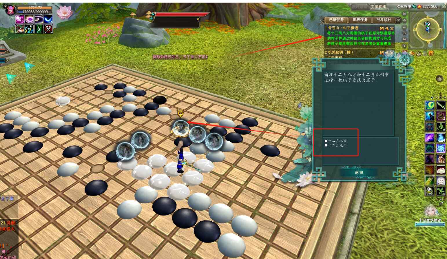 继续对话神秘老者,接到任务纠正棋局,黑白互换!一共5个棋子需要纠正,如果中途放错了,也可以找老者重置棋子位置!同样是通过棋盘十九道线来确定位置的哦!按照顺序,答案分别是:十二月八方,十三闰七斗,十四雉九州,十三闰八方,十二月九州。