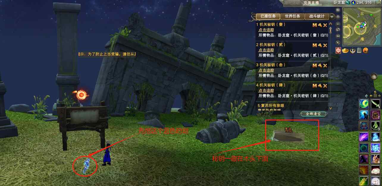 继续和丰憬(263.389)对话,接任务!然后通过地图上的“炁”传送到卧龙窟,跟着追踪黄圈,到(267.319.高度81)对话丰憬,接到任务寻找机关密钥。机关秘钥一,前往(281.316.高度84)挖地上蓝色的剑,然后去木头堆(283.315)挖下面的钥匙。