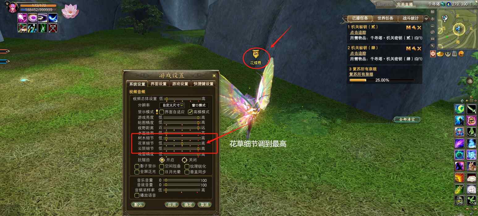 第二把钥匙,到花蝶舞(280.389.高度86)接任务,对话后,需要到花丛里面取出钥匙,不能踩到任何一朵花,否则失败重来。注意:这里是禁止飞行状态哦,然后需要把花草特效调到最高哦,不然看不到路!