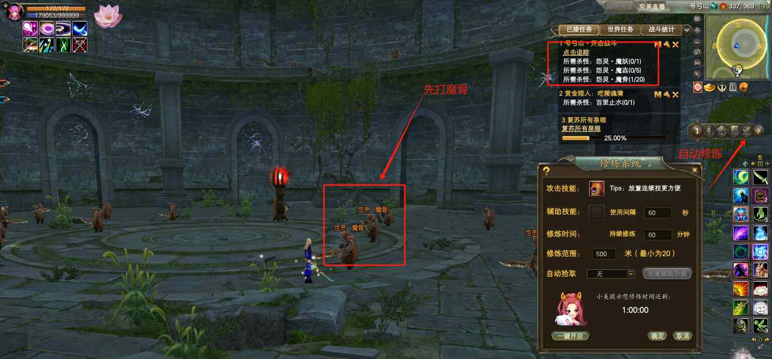 继续对话神秘老者,前往(339.346.)挖取机关,完成后回去老者交任务,对话完成后,接到“开启战斗任务”,前往(338.369.高度79)打怪,3种怪一共需要26只,难度不大,小号也能轻松完成!先打20只魔骨,再打5只魔垚,打完魔垚,魔妖才会在中间出现!(想偷下懒的小可爱,这里可以开启自动修炼打怪哦!)