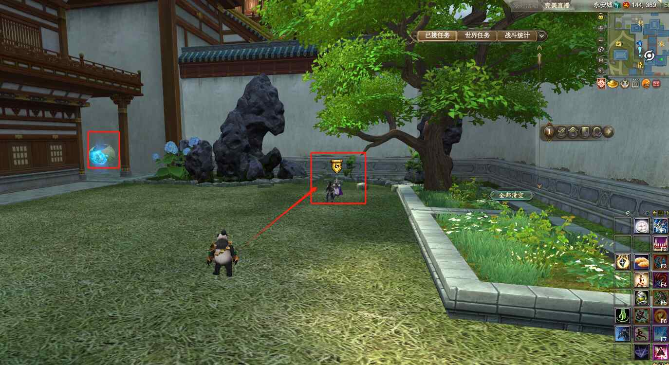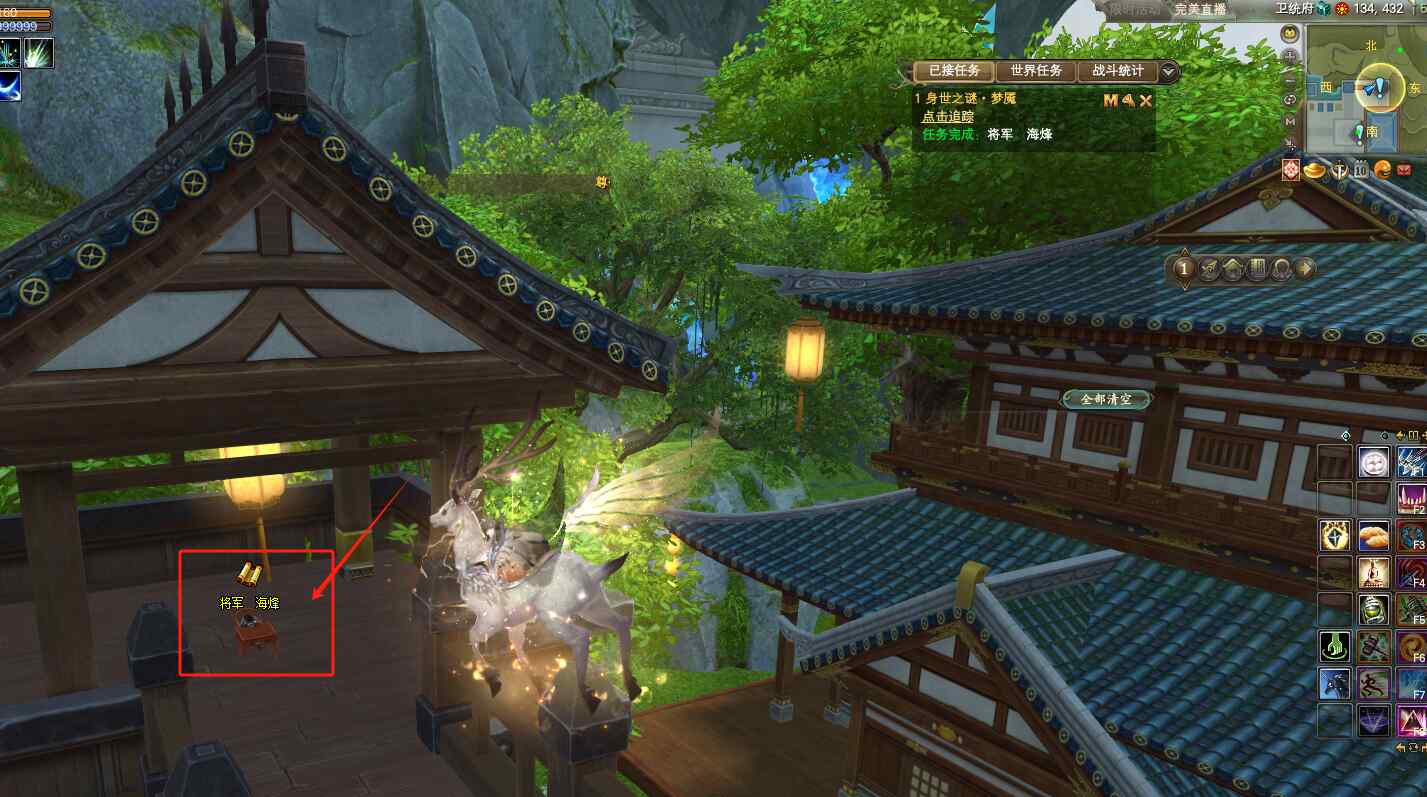 和将军海烽对话完成后,下楼到(132.432)等待10秒,会出现NPC江承宇和将军海峰,对话江承宇(132.432),接到任务面圣,我们可以传送到帝宫,然后到达(174.454)自动完成任务。