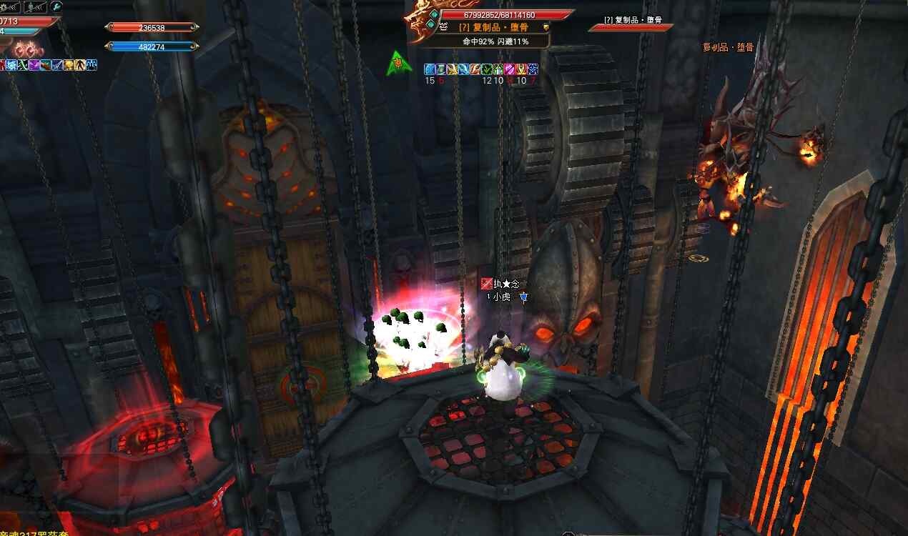 复制品.堕骨,开怪后扇形烈焰扫击只有妖兽可以抵挡,同样打掉咒巫之躯岩浆会下降。当复制品.堕骨血量下降到70%、40%会隐遁两次,需神行向前跳往返打炼狱机关的多个柱子,柱子全部打掉后复制品.堕骨才会再次出现,战斗中当心脚下红圈会给靠近玩家造成致命伤害、一个烈焰元素到达平台中心会给堕骨恢复10%生命值。战斗结束,复制品.堕骨掉落是光熠之晶。