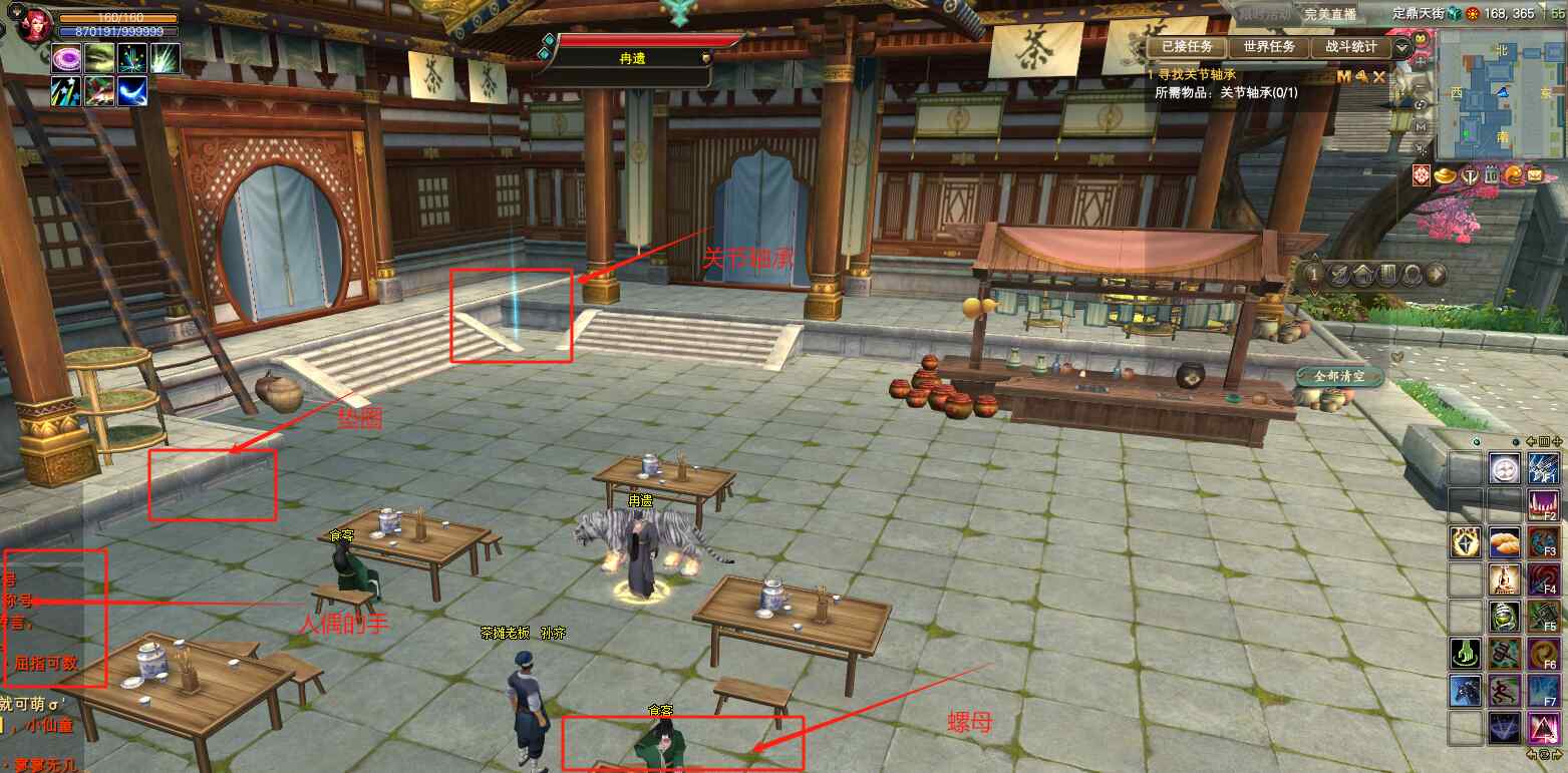 触发任务后,到溶月(168.365)处对话,等待10秒,出现NPC冉遗(168.365),和冉遗对话后出现剧情,摔坏了人偶溶月,再次和冉遗对话,接到任务损坏的人偶,分别需要找到:关节轴承(166.367),垫圈(167.365),螺母(168.364),人偶的手(167.364),都在冉遗的周围,按顺序挖,挖完一个才会出现下一个。(注意:看不到蓝色光柱提示的小可爱,打开光效设置哦!)