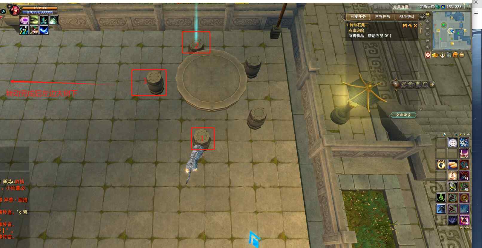 和明岳对话后,接到任务停住脚步,根据追踪黄圈提示,前往(165.335)触发任务,挖取旁边的齿轮(165.334),挖取后地面出现蓝色的箭头,指向旁边的石桌石凳(163.334),5个石凳按顺序挖取转动其中3个,打开机关后,地面再次出现蓝色箭头。指向一旁的大树下,在大树下(162.329高度55)发现据点残图·四。(注意:挖取包裹和转动石凳都是有蓝色光柱显示的,如果没有的小可爱,可能是没有打开特效显示哦!)