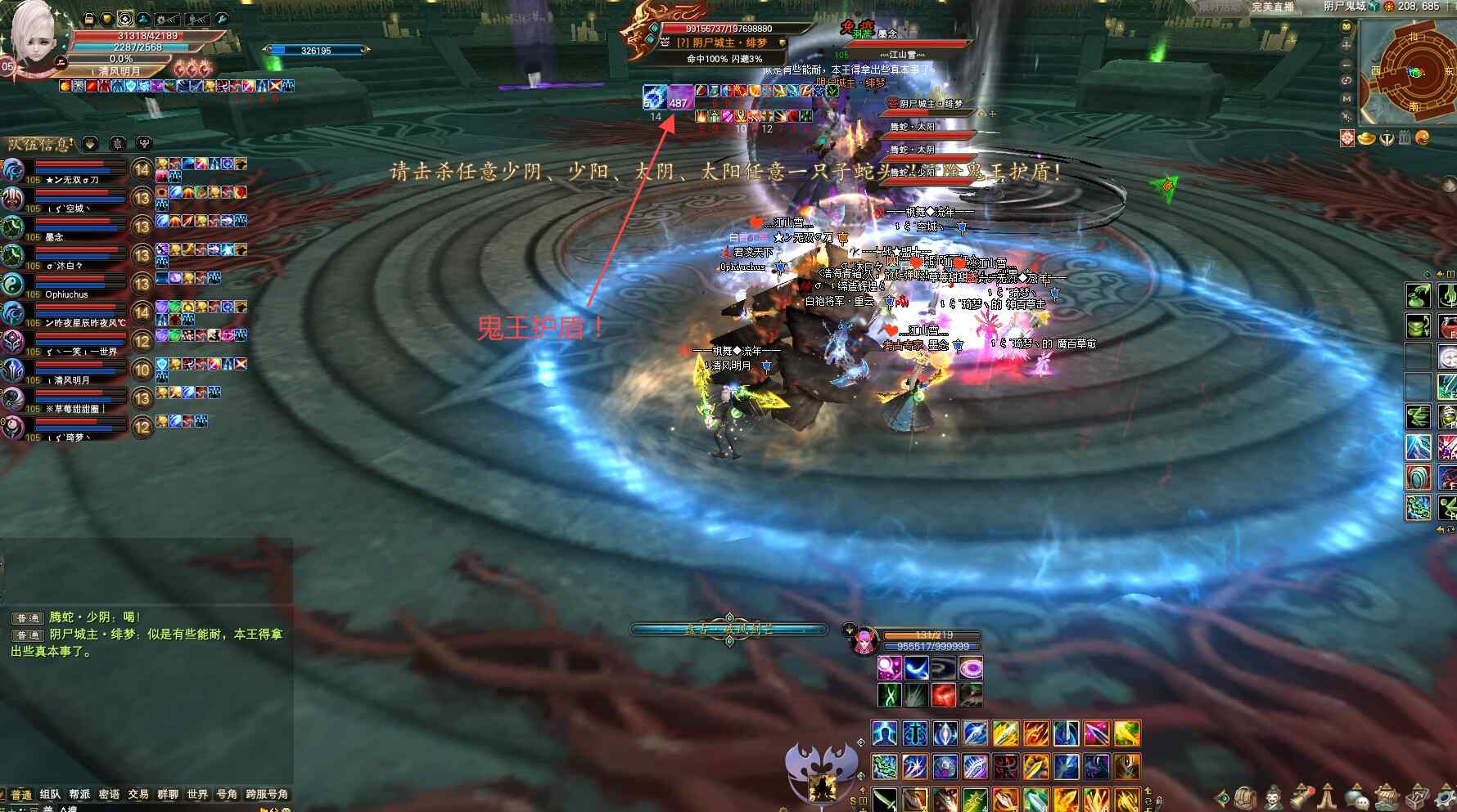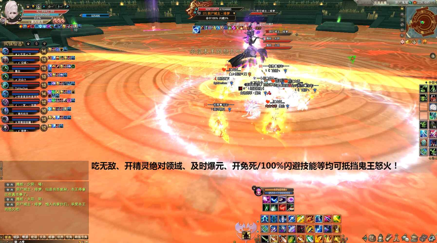 移动避火阵眼机制结束,继续战斗,BOSS将出现蛇鳞盾,需打掉少阴/少阳/太阴/太阳的一个蛇头鬼王护盾才消失,当心BOSS脚下扩散红圈注意走位保命。若提示“承受本王的怒火吧!”,建议吃无敌、开精灵的绝对领域、及时爆元、开免死/100%闪避技能等均可抵挡。