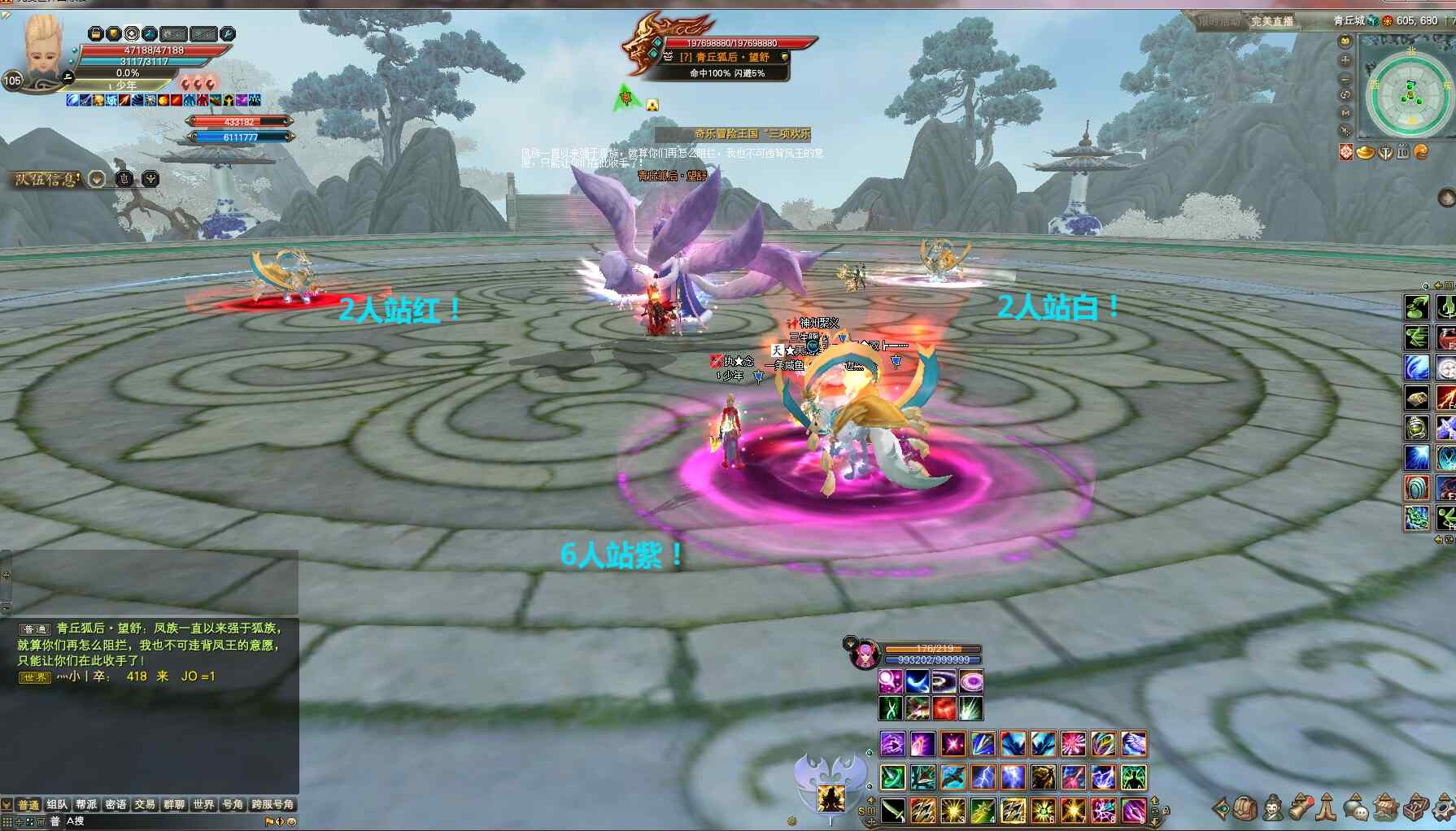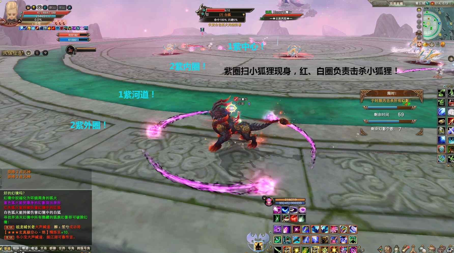 青丘狐后.望舒,是一只六尾蓝狐,狐王去世后的实际掌权者,因种种原因始终无法突破自身的禁锢达到九尾之尊而耿耿于怀,也在青丘城。首先需破解狐后迷阵,正常红色法阵站2人、白色法阵站2人、紫色法阵站6人,青丘狐后.望舒才会现身。正常羽灵开蓝阵后爆元上负面开打,当心青丘狐后.望舒随机位置扇形的“妖尾扫击”、注意走位即可,需两次破解青丘狐后.望舒的“迷踪幻境”的限时小游戏。迷踪幻境出现后,需紫圈扫图让红/白小狐狸现身、建议队长安排2紫圈外圈+1紫圈河道+2紫圈内圈+1紫圈中心如下图,然后红/白圈负责击杀对应颜色小狐狸,如小狐狸不掉血紫圈再靠近一下,若倒计时清除小狐狸失败此副本马上重置。最后击败青丘狐后.望舒,战斗结束经一帘幽梦返回梦挽澜亭。