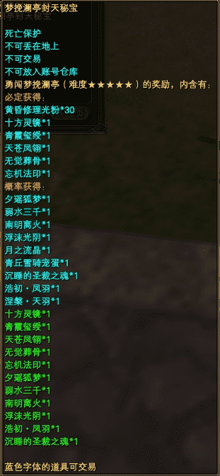 五、最后,挑战梦挽澜亭封天模式成功可获得梦挽澜亭封天秘宝如下图,可开出随机颜色1品月之流晶、12米坐骑青丘雪骑宠蛋、18品装备材料等。第一次成功挑战梦挽澜亭封天模式,可获得称号“梦廻请求醉红尘”、物理/法术攻击+10;且完成10次队长任务可获得梦挽澜亭封天银牌队长称号、物理/法术攻击+10。