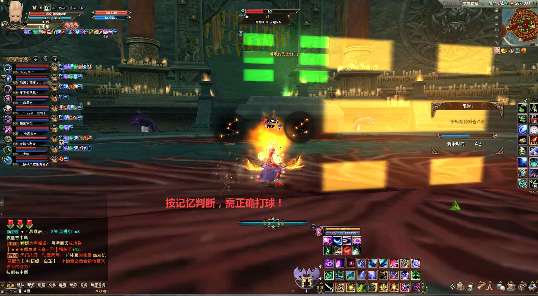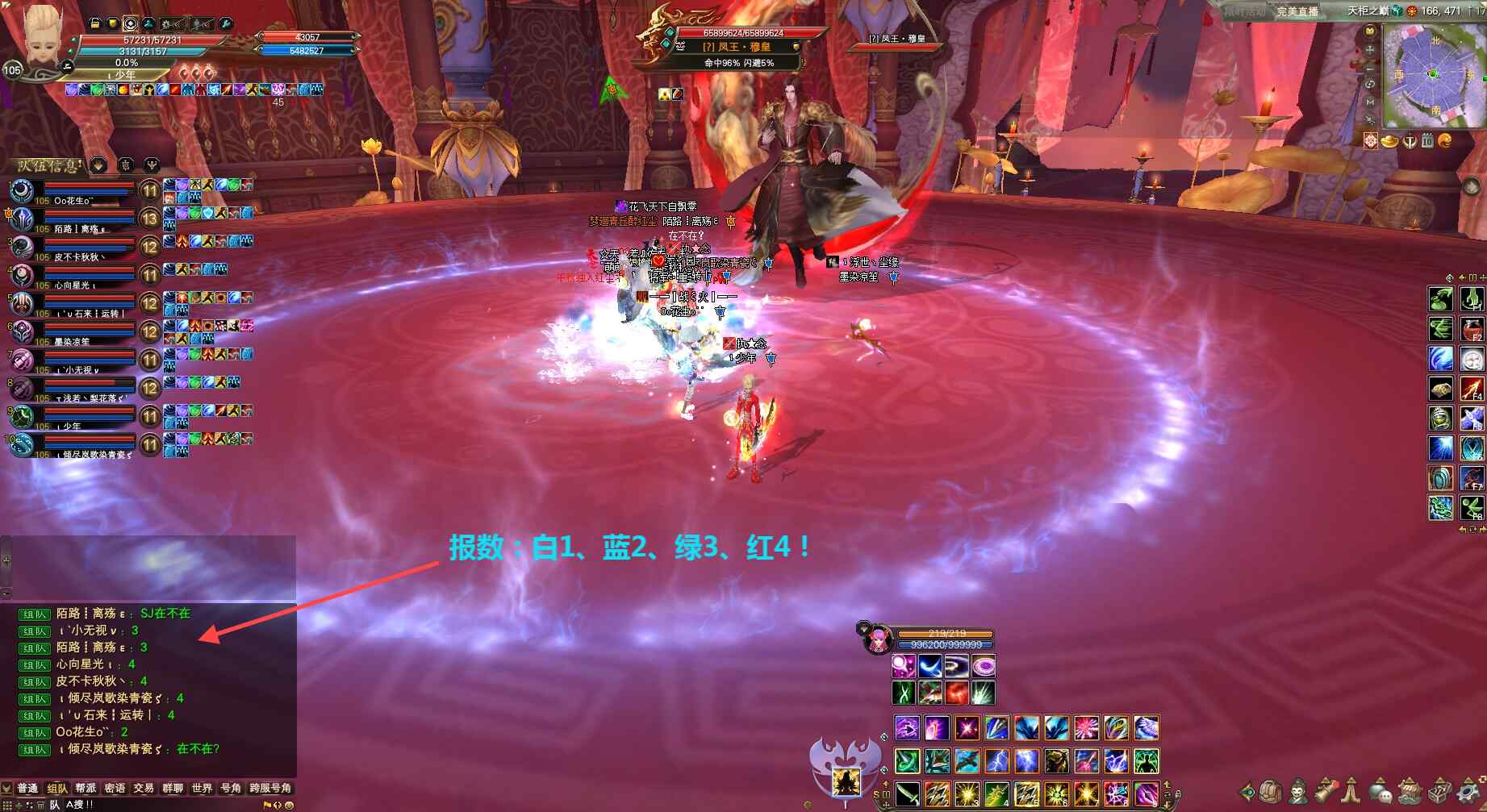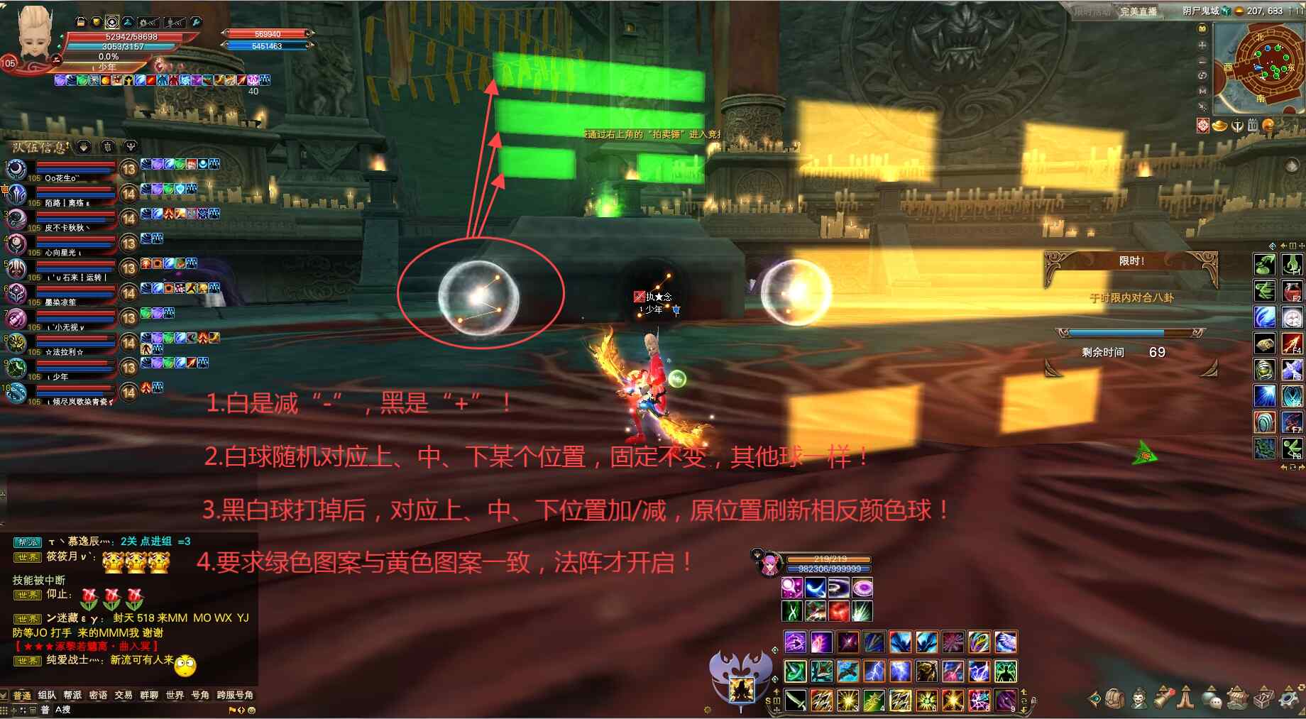 ⑴凤王真身.穆皇半血后两次出现10个蓝球,需玩家靠近蓝球获得倒计时雷电状BUFF如下图,按屏幕提示的规则正确算数站柱子等球自动掉落/用技能(如爆元/信念/信念技能/羽灵解毒等)提前掉落变绿球;