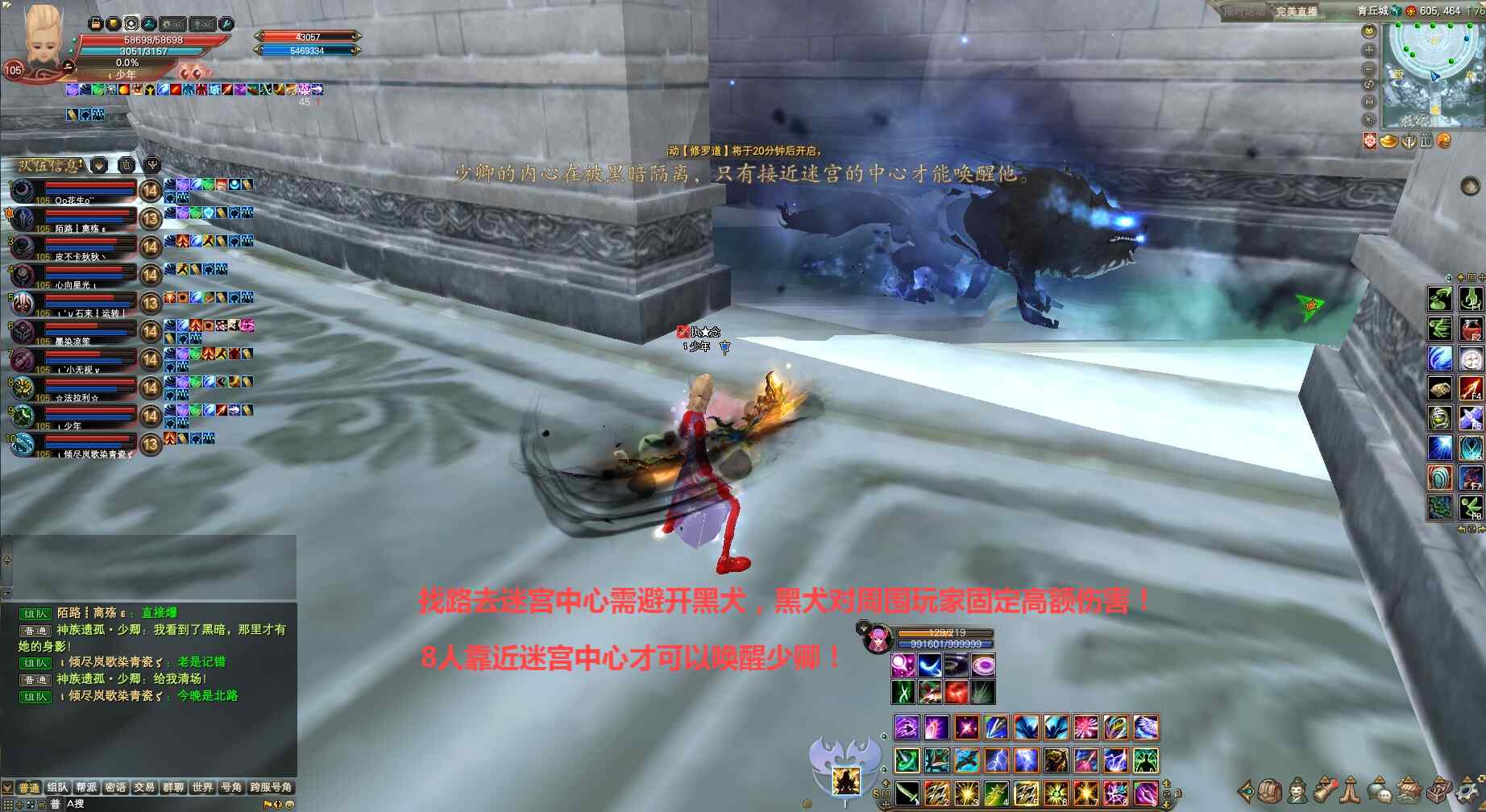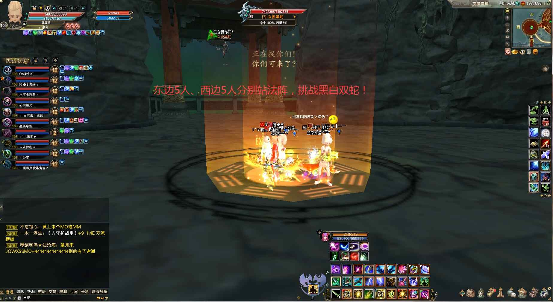 需东西各占5人,唤醒黑白双蛇,镇魂碑可由东向西/由西向东踩云朵传送,当黑白双蛇落地直接爆元攻击、切记吃伤害后才上负面技能输出,血少玩家建议吃无敌保命,打掉双蛇放行/挑战失败重打。