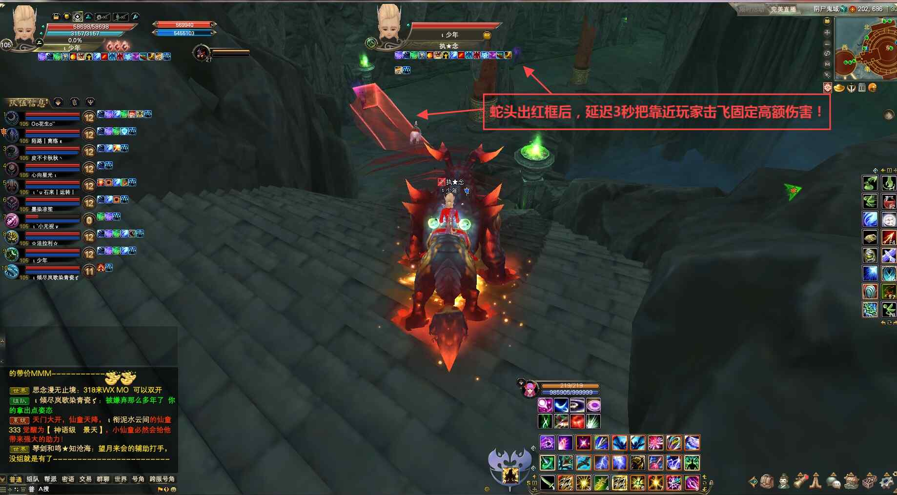 玩家上坐骑直接冲,蛇头出红框后延迟3秒把靠近玩家击飞固定伤害、血少的玩家当心。