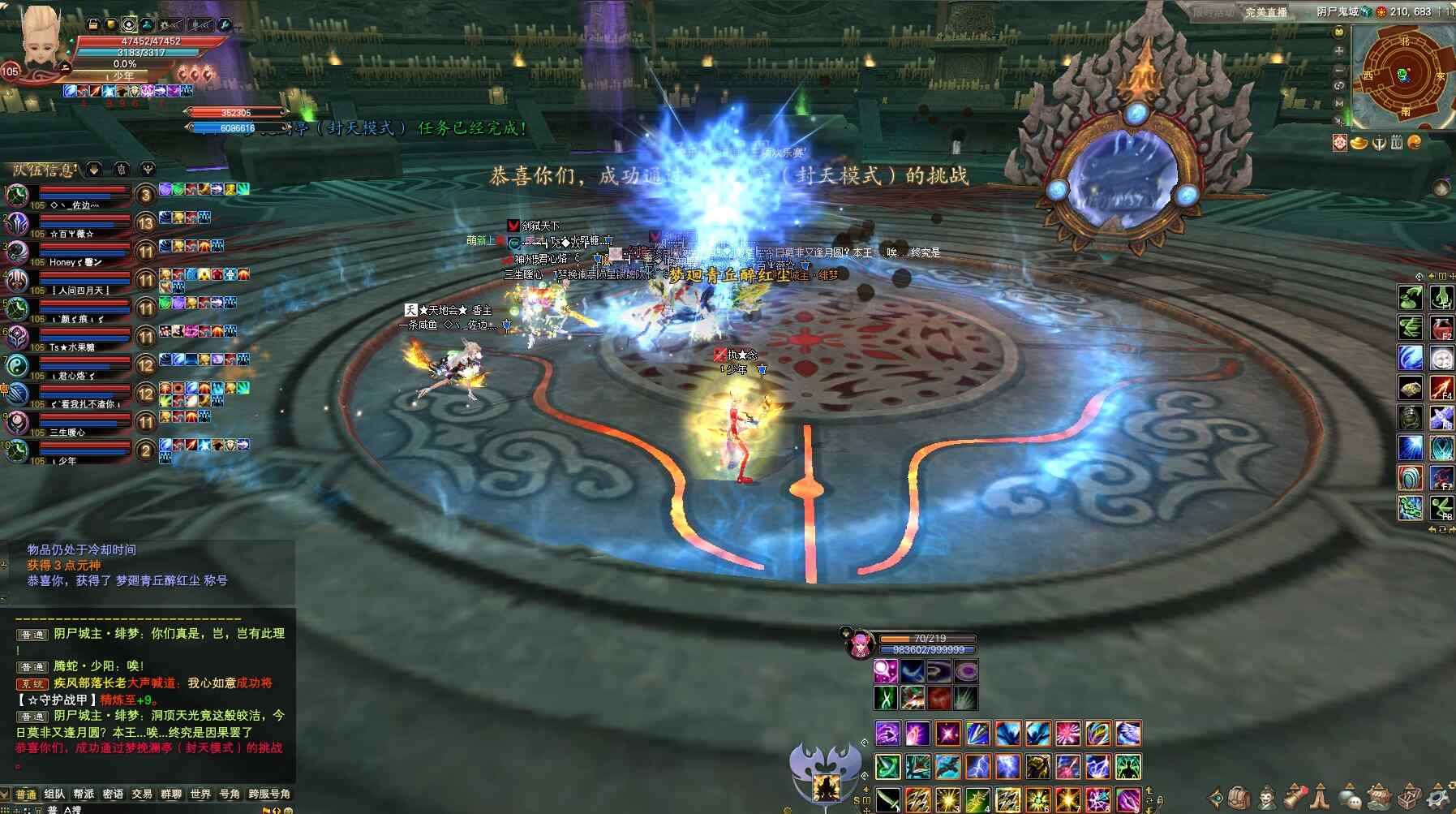 ⑻经两次打八卦、两次跑移动避火阵眼,齐心协力击败阴山城主.绯梦,战斗结束提示“恭喜你们,成功通过梦挽澜亭(封天模式)的挑战!”战斗结束,经一帘幽梦返回梦挽澜亭领取奖励。