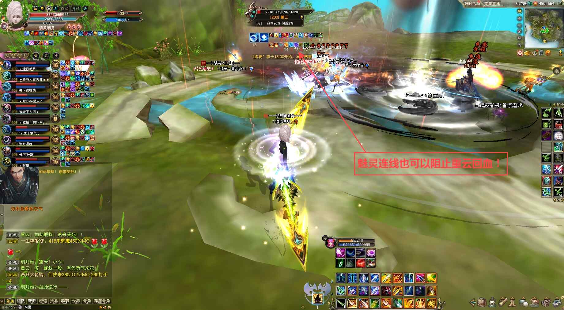 ②苍仲明第二种人格(第二阶段)打爆发伤害魅灵拉线玩法,要求队伍伤害足够限三秒内至少5亿伤害输出、且趁苍仲明7-8亿血魅灵瞅准时机拉线用技能“梵心.心燎原”阻止BOSS回血(同样魅灵拉线阶段月仙不可丢创世/妖精不可丢化石咒!),待拉线结束苍仲明直接进入最后阶段,队长提醒大家提前爆元一起集火BOSS,等吃伤害时剑灵剑印破釜武侠丢龙妖精残体等直接打掉,同样最后阶段抗怪职业注意吃无敌开免死抵挡苍仲明碾压高额伤害,最后阶段若队伍伤害高可不安排人拉黑洞双球。
