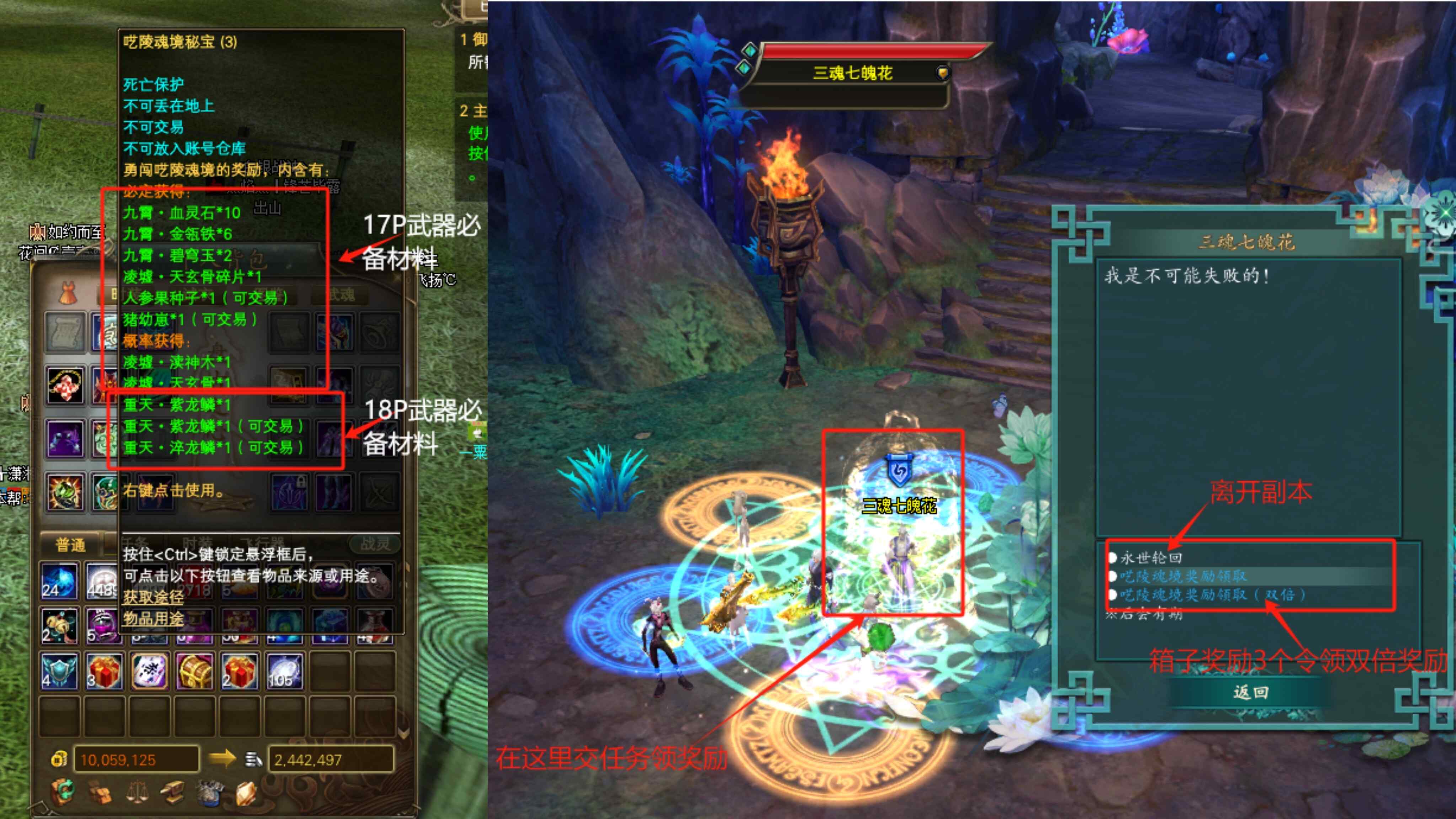 击杀完百里·止水,我们的盗墓日常任务就做完了!!!等待几秒后,会出现“三魂七魄花”,用3枚幻境灵宝·兵戈换取2个呓陵魂境密宝。可以开出做17品武器的材料,也有几率开出做18品武器的紫龙鳞和淬龙鳞哦!