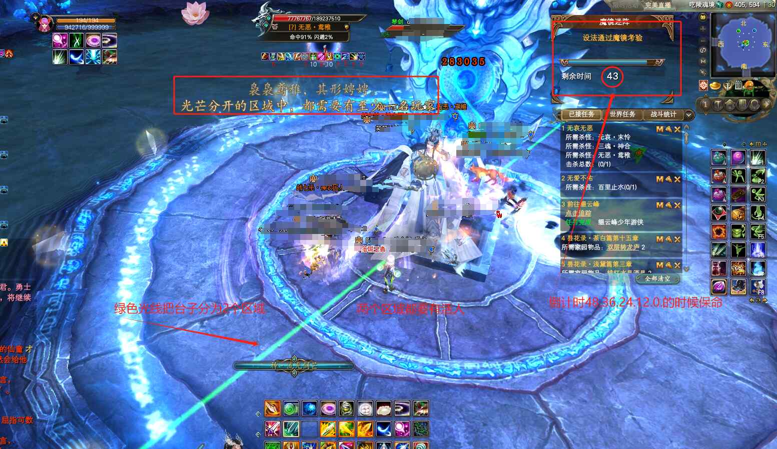 当屏幕上出字“袅袅鸢稚,其形娉娉”时,扶手上的打手都跳下来,分散站好,等地上出现一根绿色的线时,BB所在的台子被分为2个区域,这两个区域都要有活人!以此类推,出现5条线时,台子被分为10个区域,10个区域都要有活人!如果相应区域没有活人,线条变成红色,秒杀玩家!旁边有魔镜72秒倒计时,光线分别在12秒的倍数时爆裂,所以我们可以在倒计时60.48.36.24.12.0秒时爆元或者绝对保命!时间一定要卡好再爆元哦!