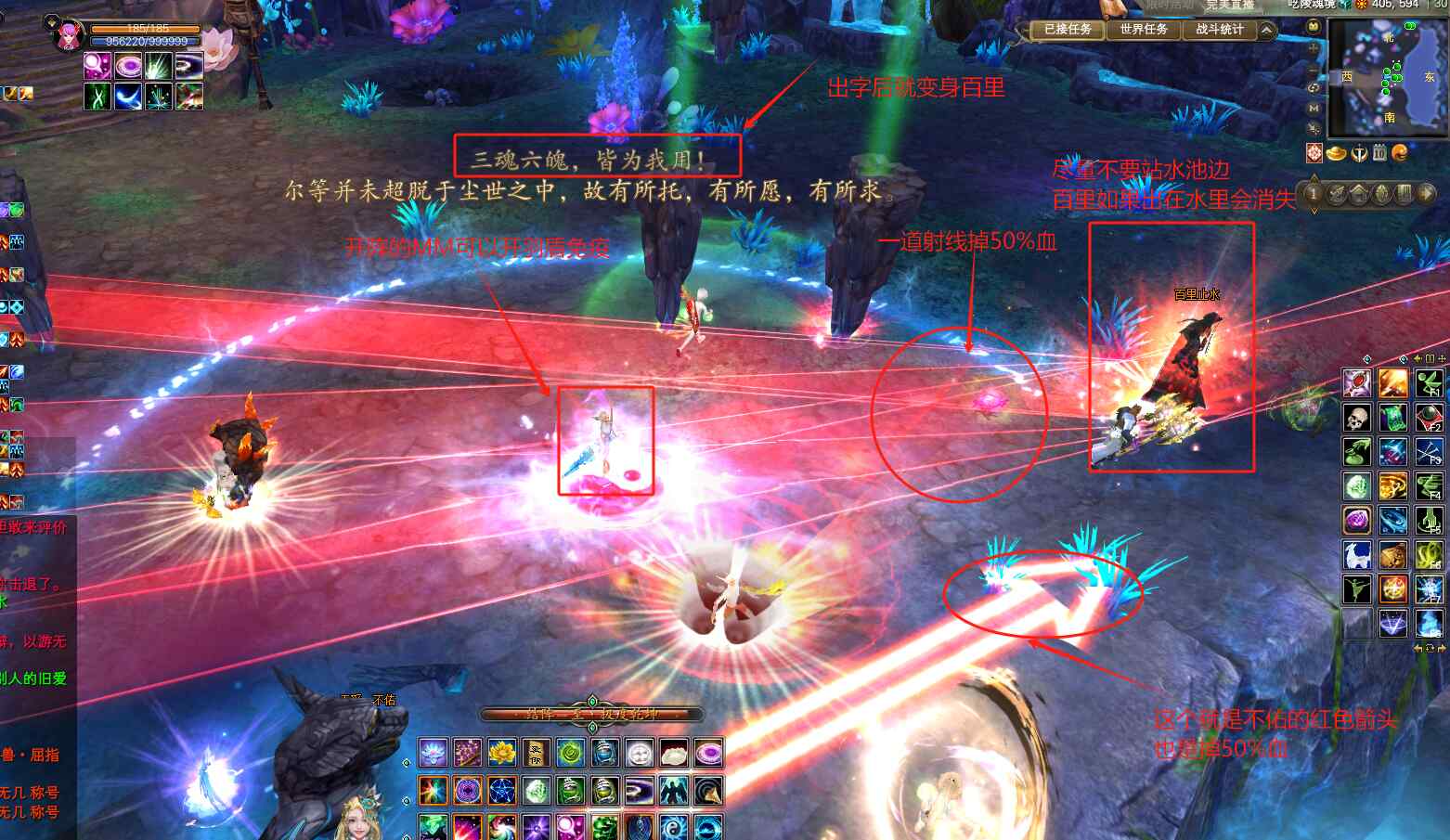 百里会向周围散发红色的长方形光条,需要及时躲开哦!光条出现3秒后,会有一道射线穿过光条,对该方向的玩家造成50%的最大生命值伤害,两根光条重叠就需要保命或者及时躲开,不然直接被秒杀。此时,MM和MG可以开羽盾免疫,SS和WX可以开1分钟的免疫技能,刺客可以开三世,在保障玩家存活的情况下,可以爆元创世集火输出一波。没有保命的时候,及时躲开,边躲边杀,尽量保命不死人,因为死的玩家越多,百里的光条就会更多的重复出现在剩余玩家身上。