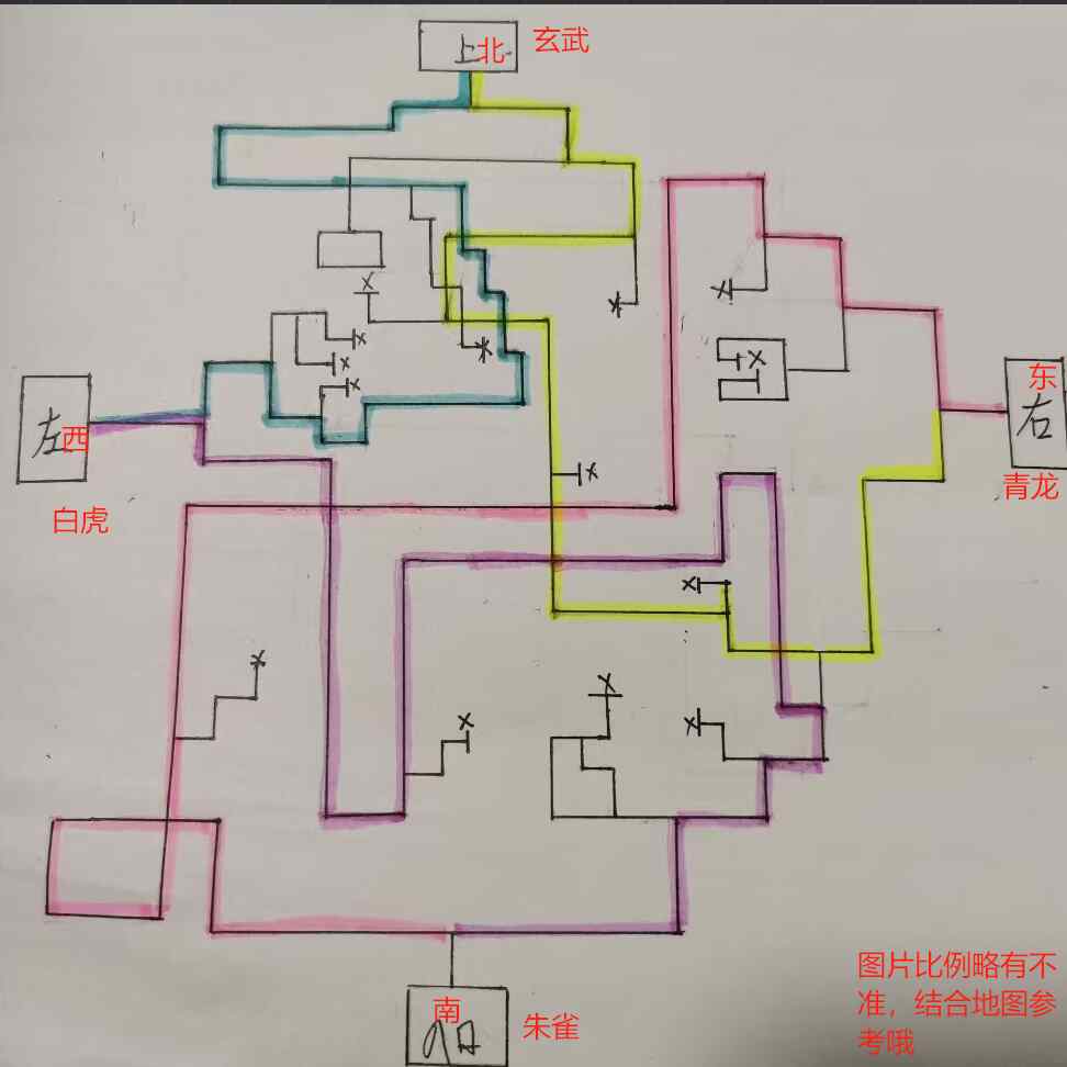 入口在西,去东边:先右再全左。去南边:先右再全左。去北方:先左再全右。
