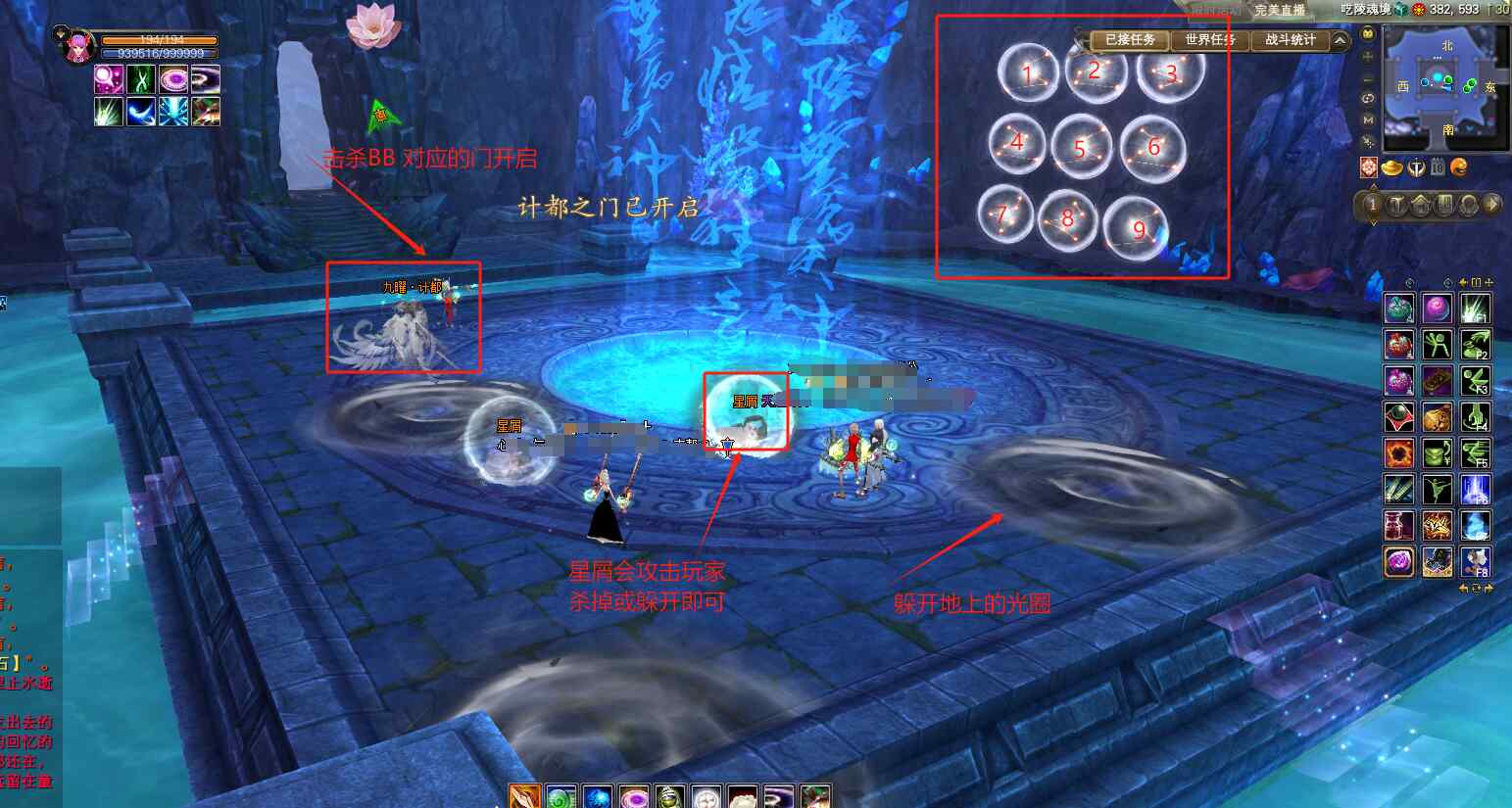 40秒以后,触发光墙机制,BB免疫伤害。一共出现5层光圈,光圈不断向内缩小范围,触碰到光墙壁的玩家,会被秒杀哦!玩家需要找到每层的出口离开,可以提前商量好那个颜色的圈先走,我们区一般是默认蓝圈先走!脚下蓝色光圈的玩家先通过出口离开,去下一层的出口,黄色光圈的玩家,在BB脚下先等一等,蓝圈走完了,黄圈在朝着出口走。脚下没有光圈的玩家就随意!这里可以开免疫技能哦,比如MM和MG的羽盾,武侠的至·金刚,刺客的三世等等,可以免疫光墙的秒杀效果,直接穿过5层光墙!